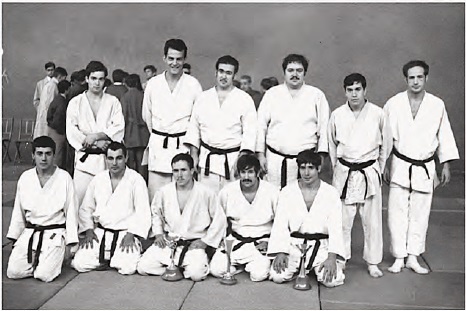 1968 T. Sánchez participa en una competición de cinturones negros que se celebró en Segovia. En la foto podemos identificar a los que más tarde serían los campeones de España e internacionales; es el caso de Rafael Ortega, José Luis de Frutos, Gonzalo Villasante y otros.